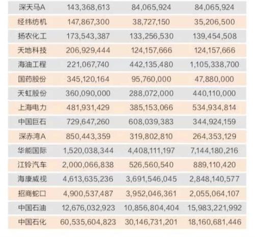 市值最大的是中国石油(601857.SH),超过一万三千亿。其次为招商银行(600036.SH),市值为5900亿元;第三为中国石化(600028.SH),市值为5850亿元;第四为中国神华(601088.SH),市值为3820亿元;第五名为海康威视(002415.SZ),市值为3590亿元。中国石油的市值相当于二、三、四名的总和。
