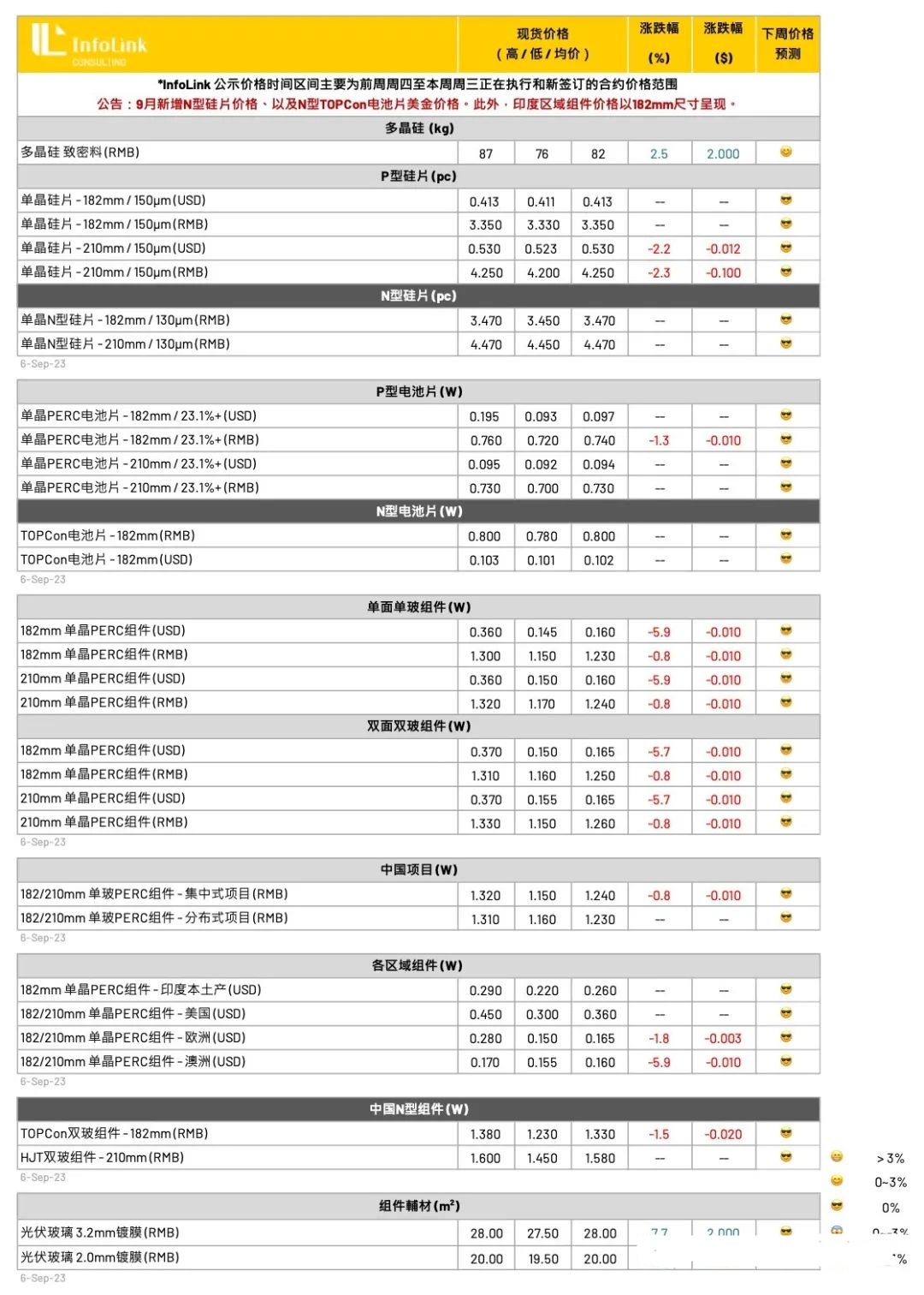 9月组件新单价格分化,一线厂家新单执行集中项目约1.16-1.24元人民币,分布式项目价格1.15-1.25元人民币、部分报价上调至1.3+的水平。