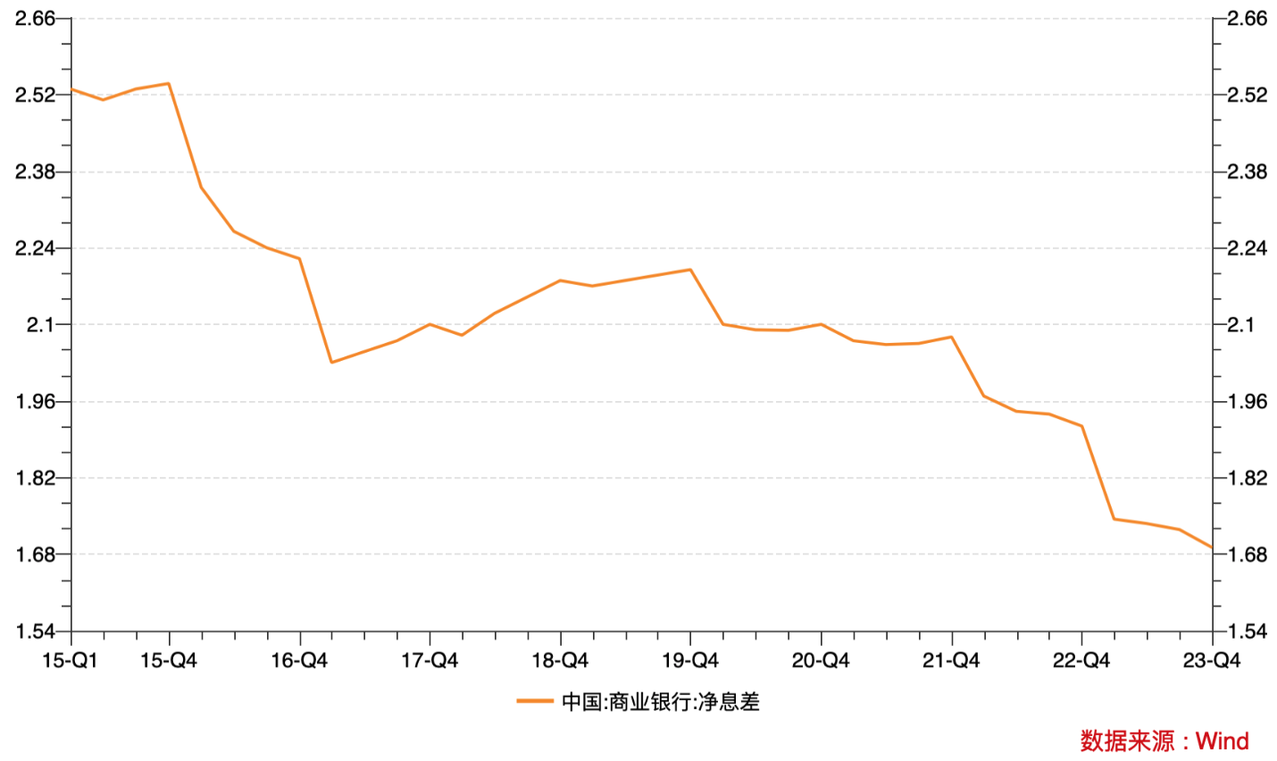 金融监管总局日前发布的数据显示,2023年商业银行净息差为1.69%,首次低于1.70%,较2023年前三季度下降0.04个百分点。分银行类型看,国有大行、股份行、城商行、民营银行、农商行、外资行净息差分别为1.62%、1.76%、1.57%、4.39%、1.90%、1.57%。