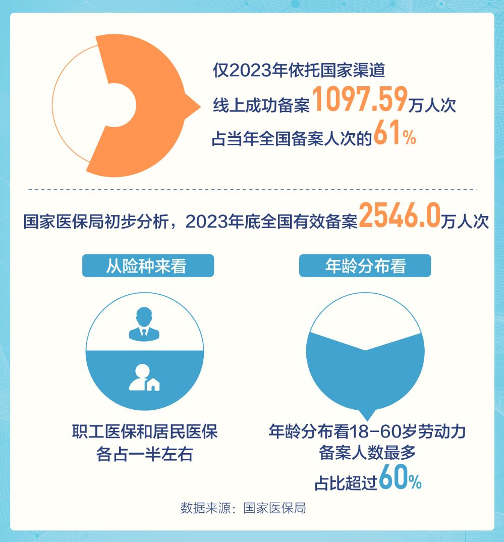仅2023年,依托国家渠道线上成功备案1097.59万人次,占当年全国备案人次的61%。国家医保局初步分析,2023年底全国有效备案2546.0万人次,从险种来看职工医保和居民医保各占一半左右,年龄分布看18-60岁劳动力备案人数最多,占比超过60%,基本建立适应人口流动的跨省异地就医管理服务支撑体系。