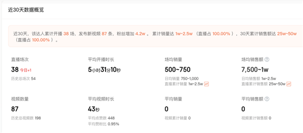 蝉妈妈数据显示,最近30天,学家优品38场直播场均销售额为7500元-1万元。直播累计销售额只有25万元-50万元。