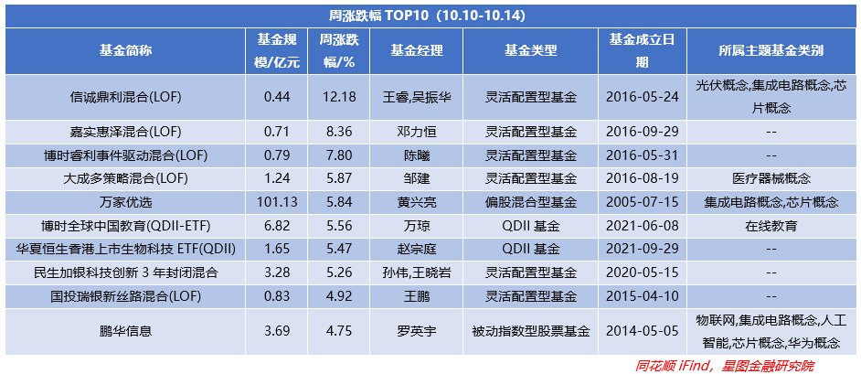从涨跌幅(A/C基金以A类或排名靠前为准)TOP10来看,被权益型型基表现最好,共计7只基金上榜,其余为2只QDII型基金、1只指数型基金,整体涨幅也有所回踩,环比-2.8pct。而且最高涨幅下滑4.3pct至12.18%,为中信保诚基金旗下LOF型基金,同时需要注意的是表现较好的基金同信息技术、医疗相关,主要受政策面引导以及市场轮动。