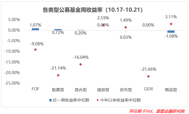 上周FOF型基金收益率中位数最高,股票型、混合型基金在权益市场的带动下收益有所回升,商品型基金回车幅度最大,债券型、货币型基金涨幅变化不大,大部分类型的基金周收益率中枢在改善,带动年收益率中枢环比上浮,除了商品型基金。