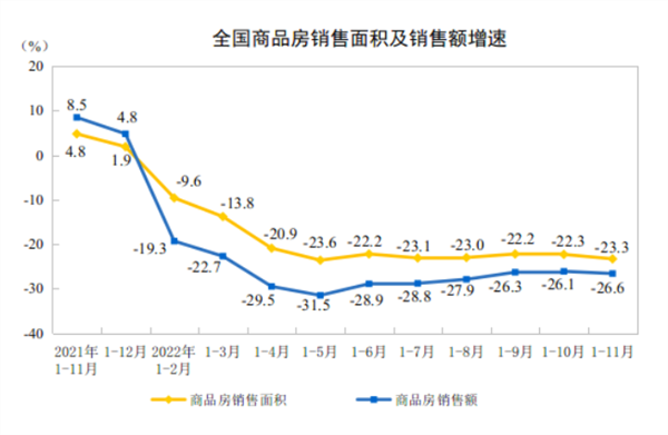 国家统计局12月15日发布的最新数据显示,1-11月份,商品房销售面积同比下降23.3%,商品房销售额同比下降26.6%,降幅分别扩大了1个和0.5个百分点;房地产开发投资同比下降9.8%,降幅扩大了1个百分点;房企到位资金同比下降25.7%,降幅扩大了1个百分点。