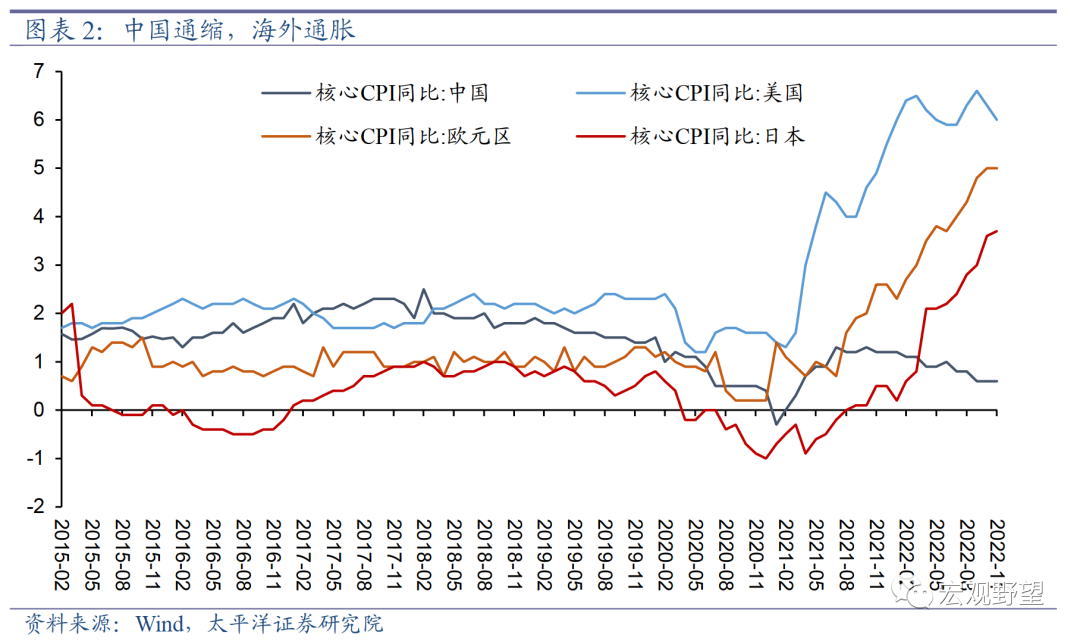 海外各国由于政治制度上的差异,无法做到“动态清零”,只能被迫选择与病毒共存。其优势在于居民和企业对于社会政策的预期较为稳定,所以消费和投资的意愿较强,加之海外多数国家疫情期间的政策刺激力度非常强,所以总需求旺盛。但是劣势在于疫情形势不稳定,由此带来供应链的不稳定。此外,年初爆发的俄乌冲突也加剧了供给端的冲击。供弱需强的格局决定了疫情后海外各国整体上受到是“通胀性冲击”。也就是说,虽然2022年国内外经济都面临下行压力,但是类型是不同的。从数据上可以非常明显地看到这一点。在全球主要经济体中,只有中国的核心CPI从2021年年中以来持续下行,显示出非常明显的通缩压力,而美国、欧元区甚至长期处于通缩环境中的日本,其核心CPI都出现了快速上扬。中国“通缩”、海外“通胀”的背离决定了2022年中国整体政策环境是宽松的,而海外宏观政策是收紧的。这一背离导致中国全年的汇率和资本流动都面临了较大的压力,宽松政策的空间和力度也受到了一定程度上的制约。