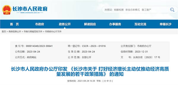 4月24日,长沙市发布《长沙市关于打好经济增长主动仗推动经济高质量发展的若干政策措施》的通知。