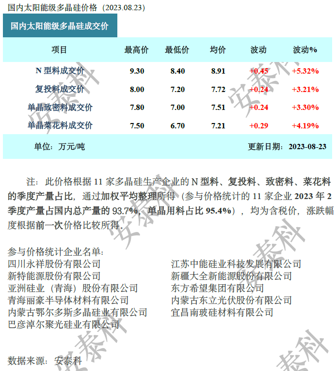 中国有色金属工业协会硅业分会数据显示,本周国内N型料价格区间在8.4-9.3万元/吨,成交均价为8.91万元/吨,周环比涨幅为5.32%;复投料价格区间在7.2-8万元/吨,成交均价为7.72万元/吨,周环比涨幅为3.21%。