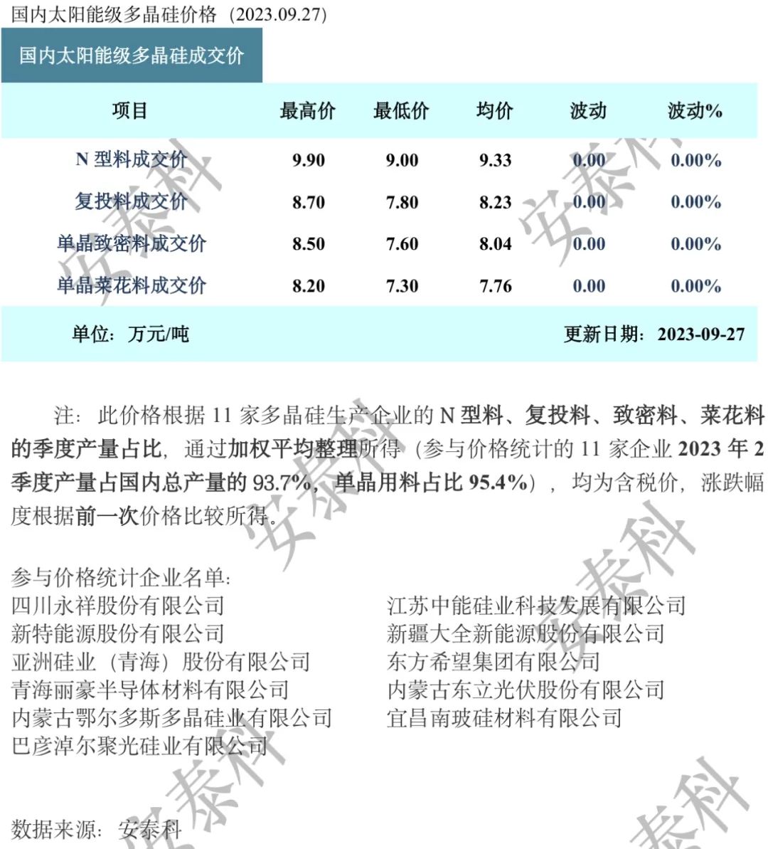 证券之星光伏行业周报:中国有色金属工业协会硅业分会数据显示,本周国内N型硅料价格持平,多晶硅市场博弈待需求。平安证券最新研报指出,铜电镀助力光伏电池金属化环节降本增效。当前HJT降本增效与下游招标进展提速,XBC电池获得更多企业储备和量产布局,铜电镀市场空间有望进一步打开。宏观方面,国家发展改革委印发《电力需求侧管理办法》,加强全社会用电管理。企业方面,通威股份宣布终止160亿元定增,20万吨高纯晶硅等项目仍继续推进。国投电力、中国核电、上海电力发布1月至8月发电量、装机完成情况。