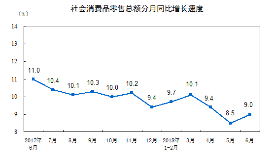 2018年6月份,社会消费品零售总额30842亿元,同比名义增长9.0%(扣除价格因素实际增长7.0%,以下除特殊说明外均为名义增长)。其中,限额以上单位消费品零售额12448亿元,增长6.5%。