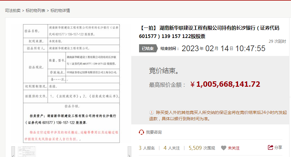 其中,2021年8月,新华联建设持有的长沙银行1.26亿股股权被拆分为两笔,在阿里司法拍卖平台结束竞拍,最终省属国企华菱钢铁集团耗资9.21亿元摘得这两笔股权。新华联石油持有的525.3万股该行股权拍卖项目则最终由物产中大金属集团耗资4152.3万元竞得。